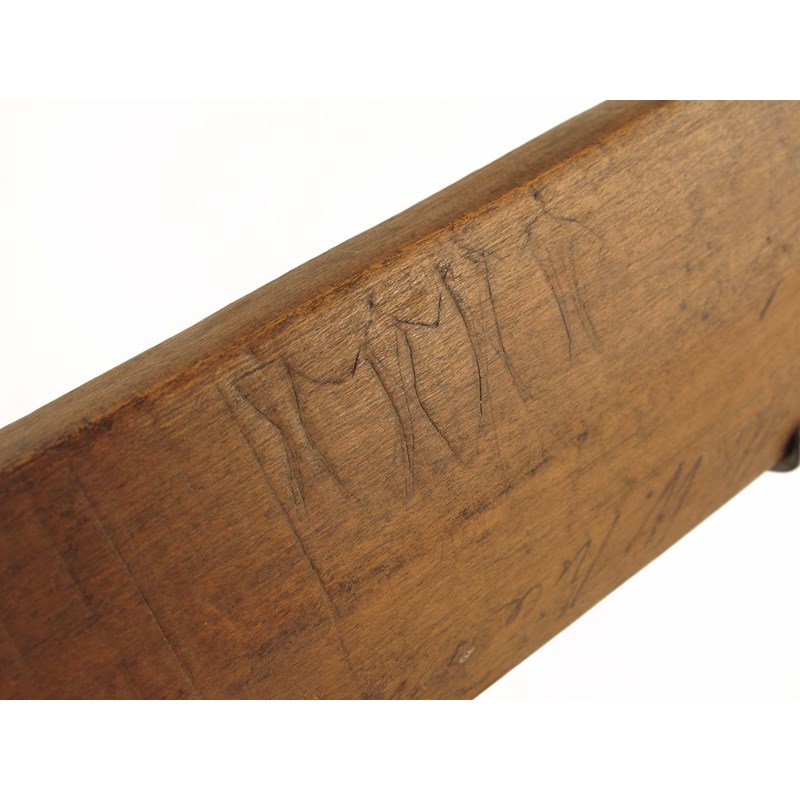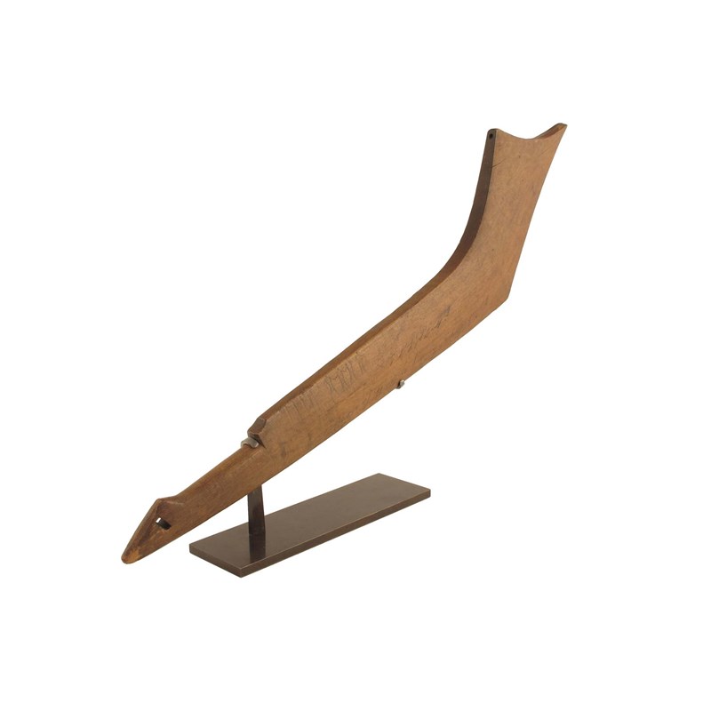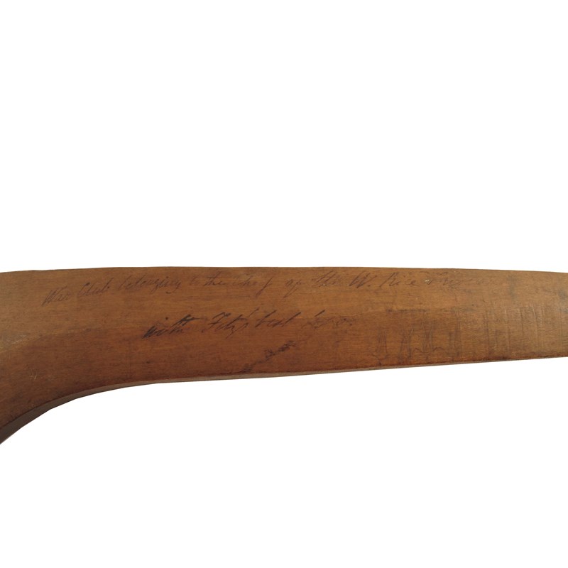 A North American Woodland war club, of gun stock form with gentle faceted surfaces, one side ebonised with dog's tooth notches to the curved end with red staining and a pierced corner, the reverse with four incised figures and later inscribed in ink 'War Club belonging to the Chief of the W. .ice Indians / with Fitz's....', 26.75in (68cm) l, on a later stand. (2)