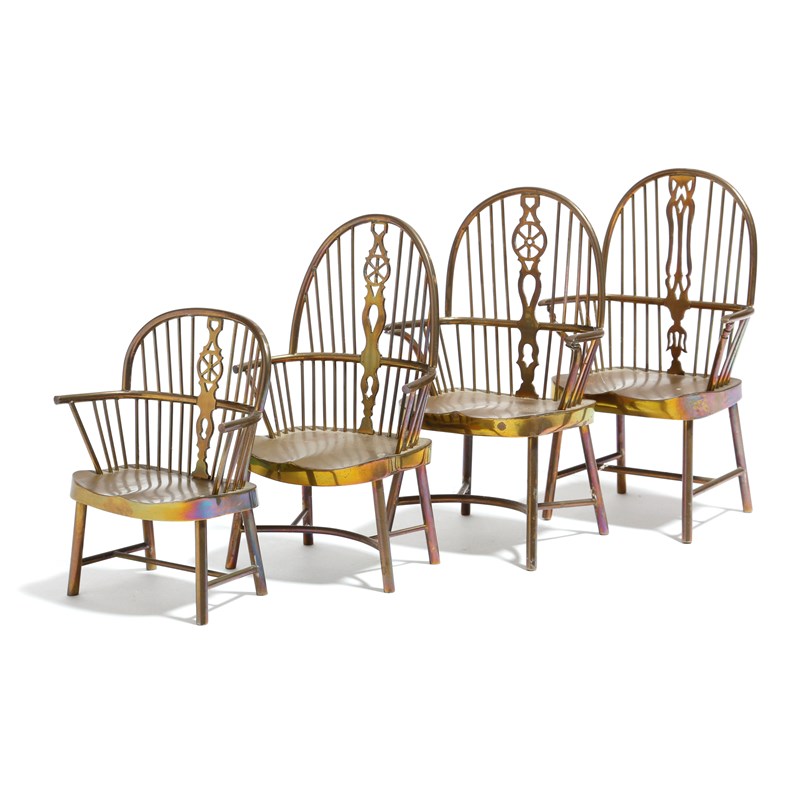 Four brass miniature models of Windsor armchairs, two with paper labels with dates of manufacture and signed in pen 'ROWLY BROWN', late 20th century, 15.7cm high. (4)