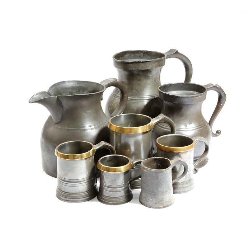 An 18th century pewter gallon baluster measure, with a scroll handle, marked 'GALLON' with a 'Crown 28' mark, 26.4cm high, together with seven other pewter measures, three with brass rims. (8)