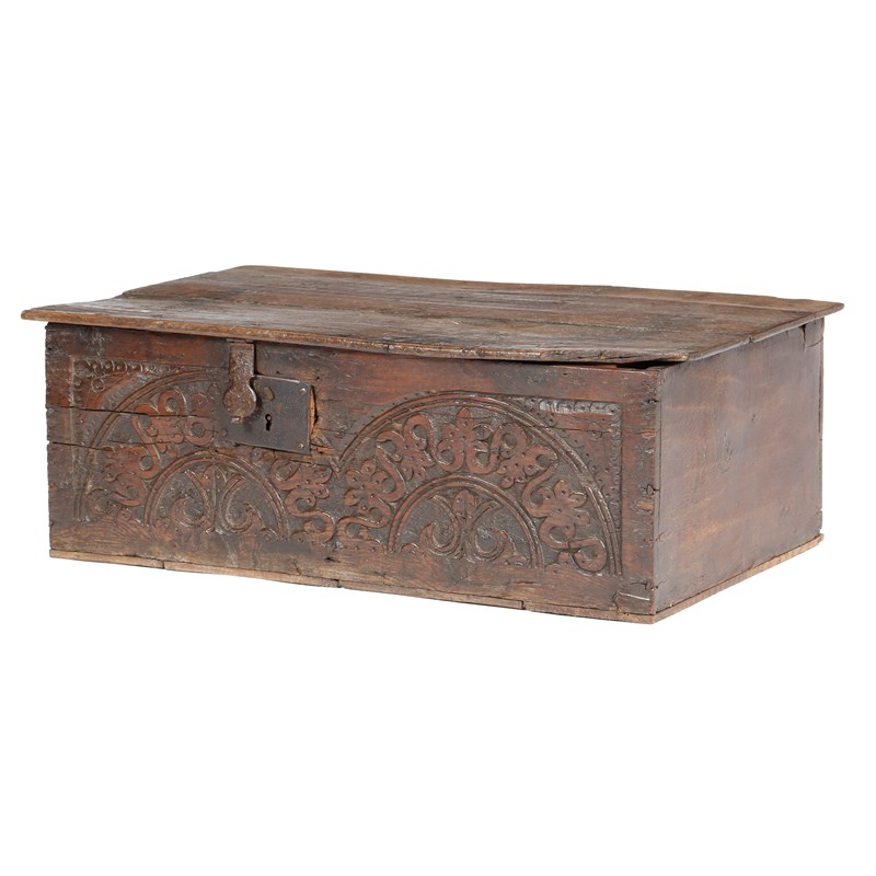 A mid-17th century West Country oak bible box, the boarded hinged top above a foliate carved lunette front, possibly Exeter, 25.8cm high, 72.2cm wide, 43.6cm deep.