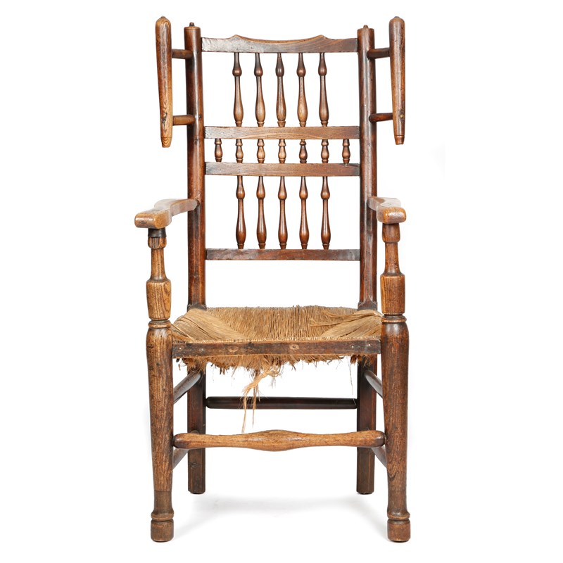 An early 19th century Lancashire / Cheshire style ash and fruitwood armchair, the spindle back with turned wing supports, above a rush seat, on turned front legs united by stretchers.