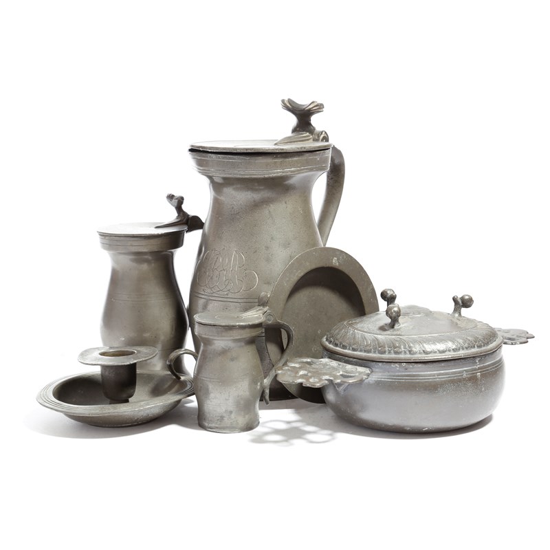 A small collection of pewter