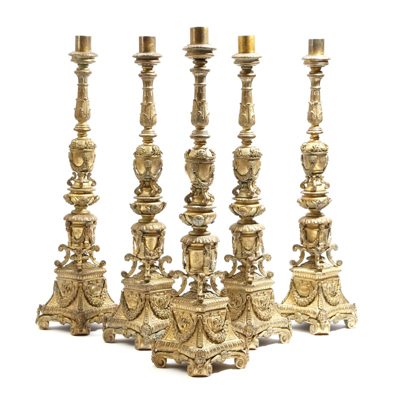 A set of five 18th century Italian Venetian gilt bronze altar style candlesticks