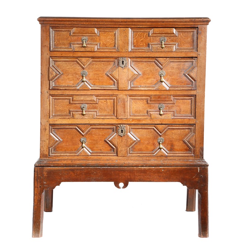 A William and Mary oak chest, the rectangular top with a moulded edge, above four geometric panelled long drawers, on a later oak stand, 118.8cm high, 92cm wide, 55.7cm deep.