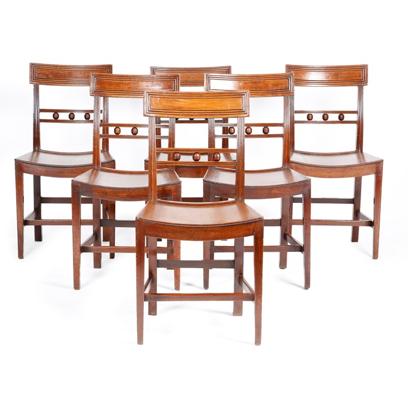 A set of six early 19th century East Anglian mahogany side chairs, each with a tablet back and a horizontal ball splat, above a dished seat, on square tapering legs united by 'H' stretchers, the underside of one inscribed in chalk 'MISS BATSTONE BLUNDELL'S'. (6)
