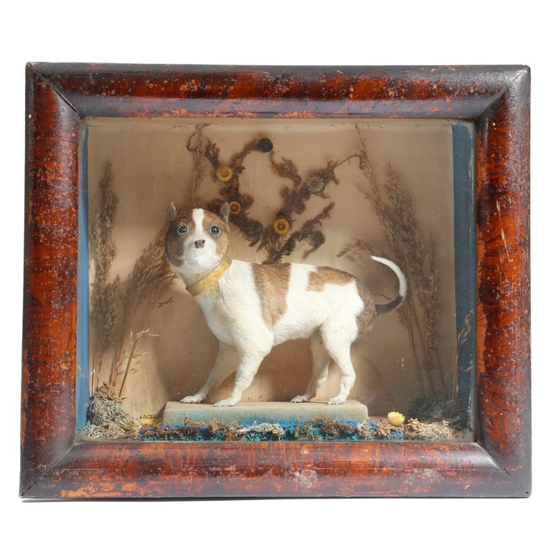 An early Victorian folk art model of a miniature dog, with glass eyes and a gilt metal collar, mounted in a naturalistic setting with grasses and flowers, in a glazed stained pine case, 26.5cm high, 30.5cm wide, 13cm deep.
