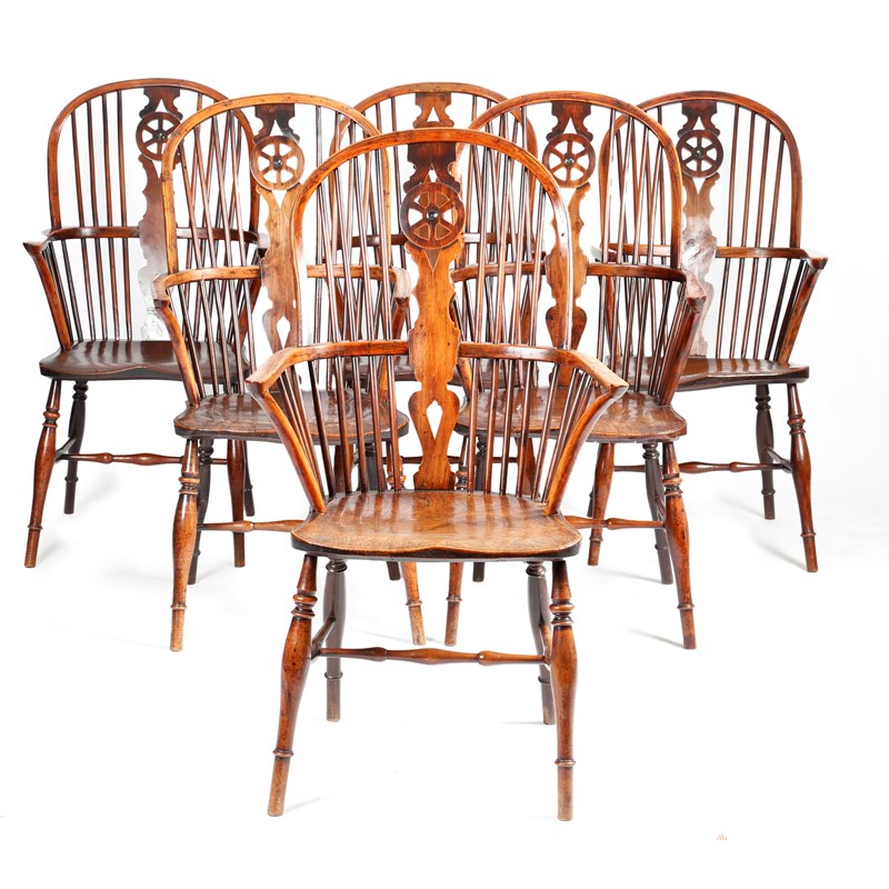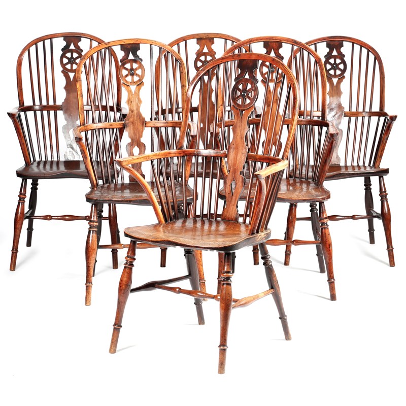 A set of six early 19th century yew Windsor armchairs by Robert Prior