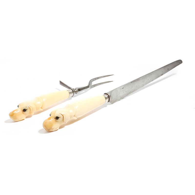 λ A Victorian ivory and steel carving set, the handles carved with dog's heads, the knife blade stamped 'J. WALTER & Co. 25 BURGESS STREET, SHEFFIELD', the fork with a hinged rest, 43cm long (max). (2)