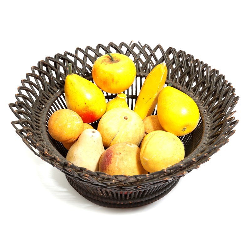 An ebonised wicker fruit bowl, containing thirteen painted stone models of fruit, including: a banana, apricots, peaches, pears, an apple and a fig, 33cm wide. (14)