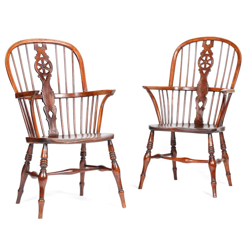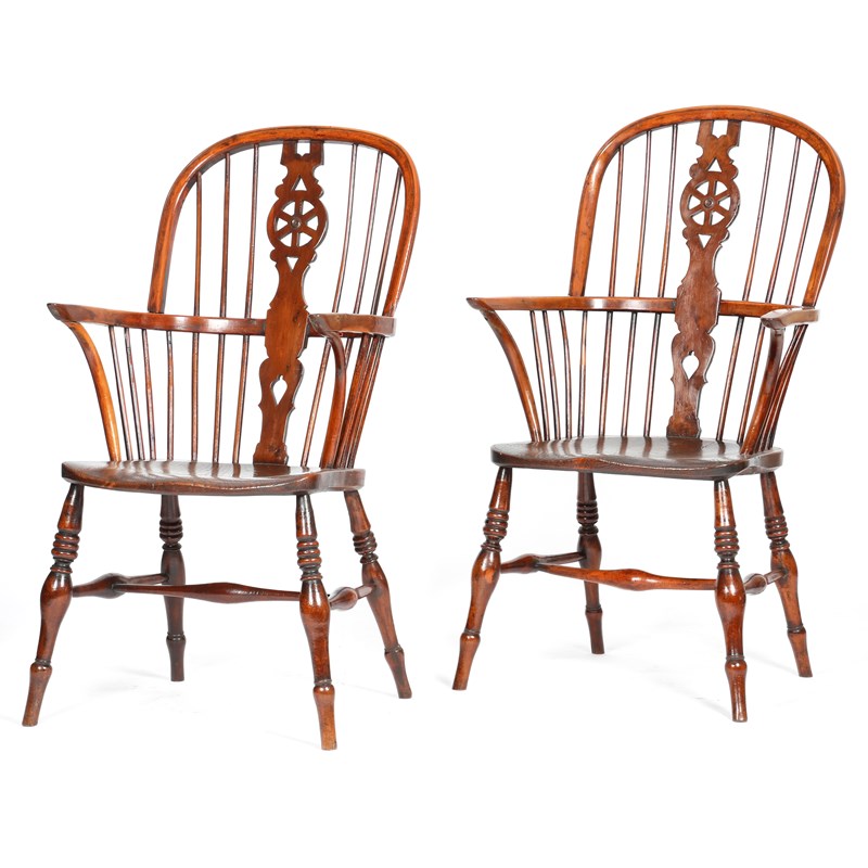 A matched pair of yew high back Windsor armchairs in the manner of Robert Prior, each with a pierced wheel back, above an elm seat, on turned tapering legs united by a stretcher, first half 19th century. (2)