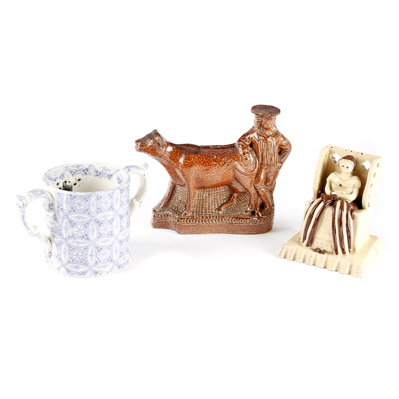 An early 19th century stoneware money box, in the form of a farmer with a cow, together with a pearlware 'frog' two handled mug, the interior with two frogs, the printed body with a verse and an 18th century style pottery 'pew' type figure of a lady seated on a chair, 20cm (max). (3)
