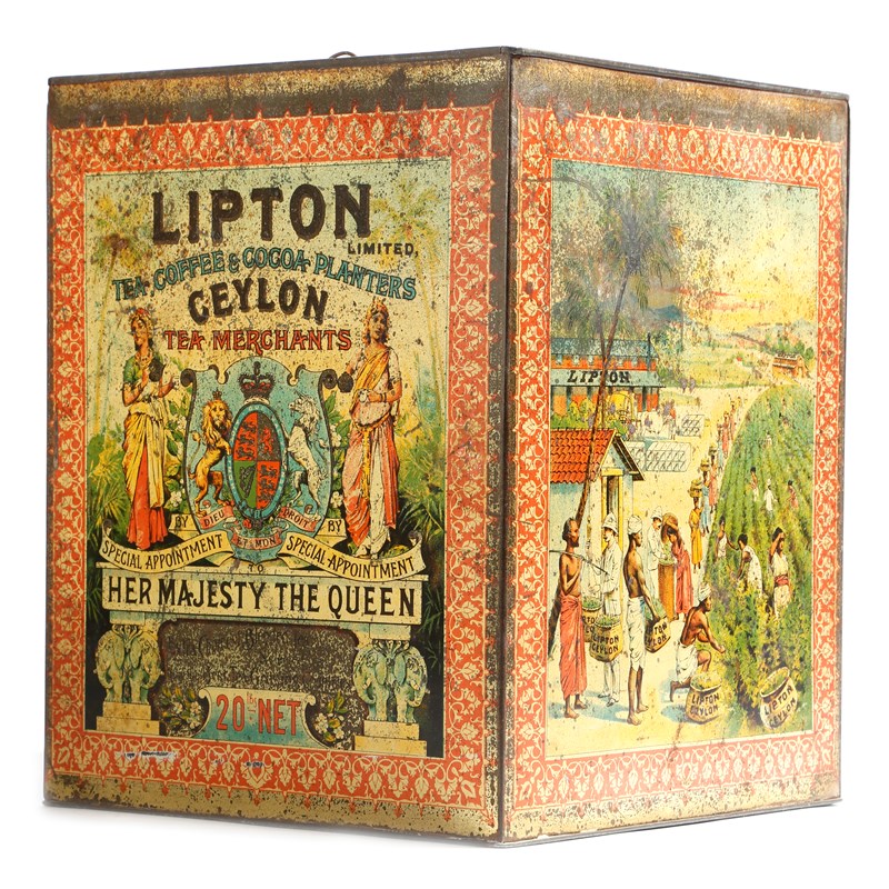 A large Lipton tôle tea canister, the top with a flap lid and a ring handle, the sides polychrome decorated, depicting scenes of producing tea, one side with the Royal Coat of Arms being held by two Ceylonese women in traditional clothing, with the inscription 'LIPTON LIMITED, TEA, COFFE & COCOA PLANTERS, CEYLON, TEA MERCHANTS', 35.3cm high, 27.5cm square.