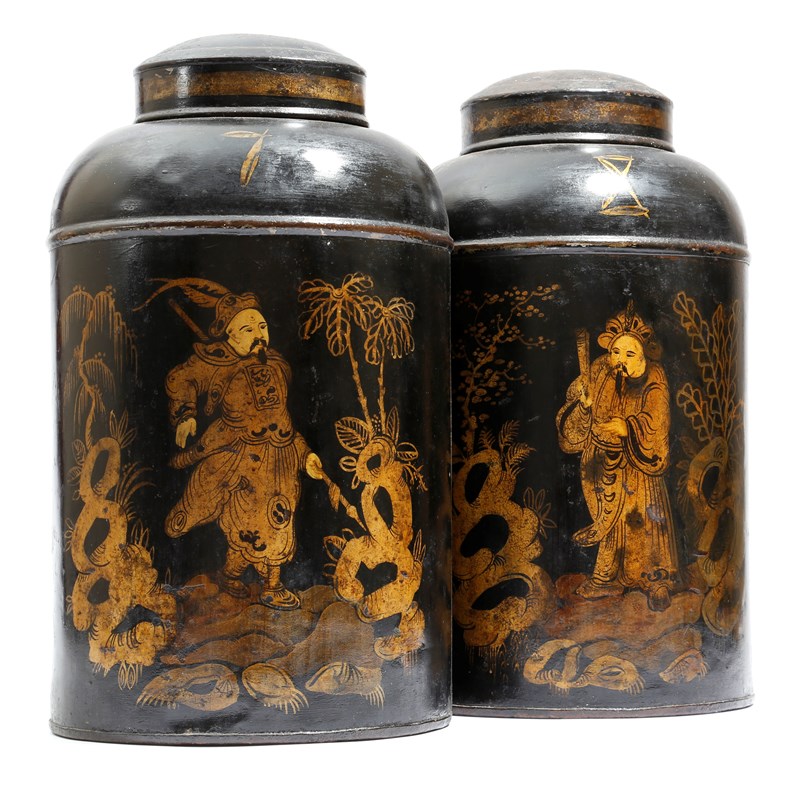 A pair of late Victorian black japanned tôle tea canisters, decorated in gilt with Chinese figures, numbered 'X' and '7', 39.7cm high, 22.5cm diameter. (2)