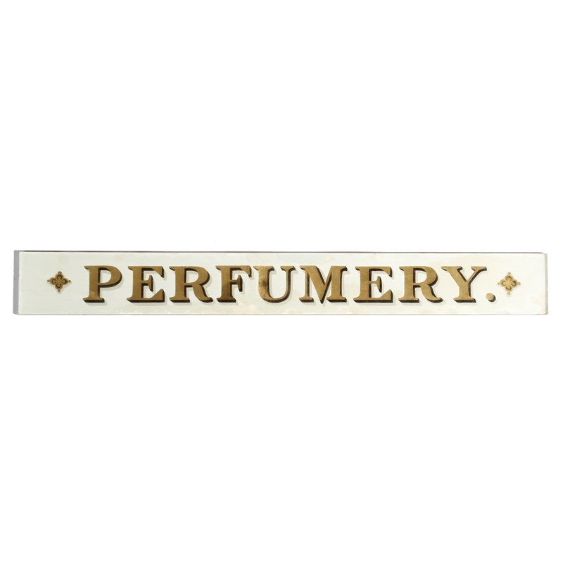 A Victorian verre églomisé shop sign, 'PERFUMERY', 7 x 57cm.