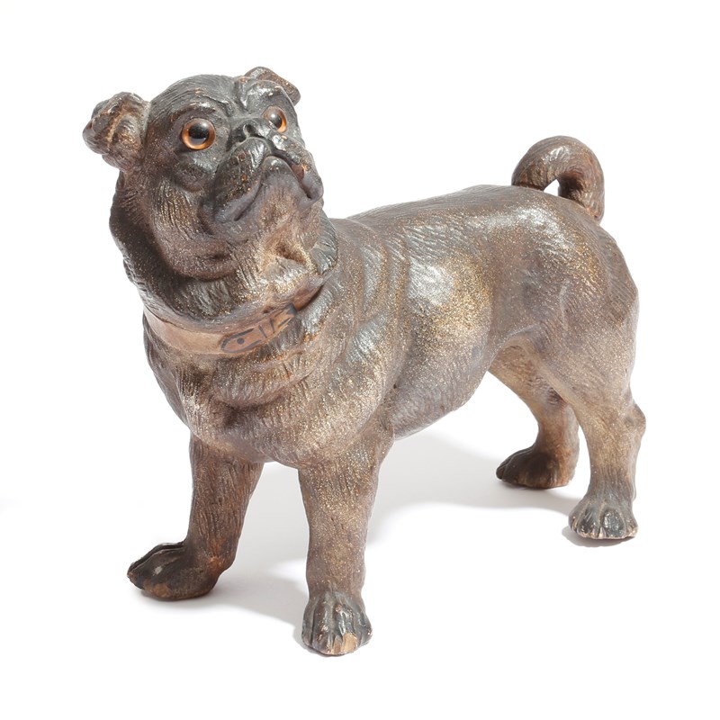 A German polychrome decorated terracotta model of a standing bulldog, with glass eyes, late 19th century, 20.2cm high, 23.5cm wide.