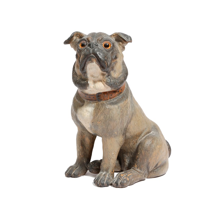 A German polychrome decorated terracotta model of a seated bulldog, with glass eyes, numbered in pencil '6020', late 19th century, 19.5cm high, 15.5cm wide.