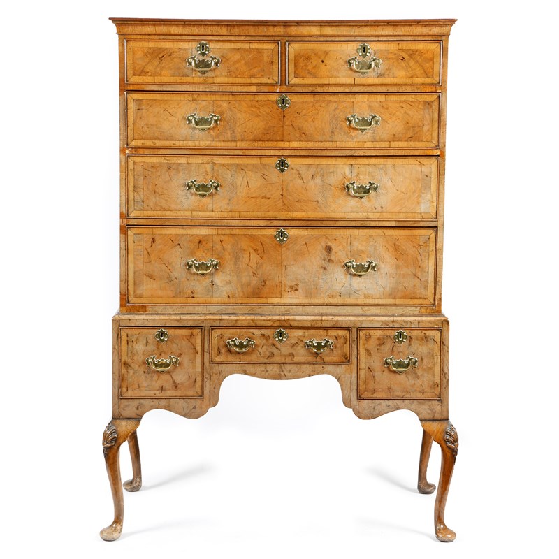 A walnut chest on stand in George II style, the veneered crossbanded top above two short and three long drawers, the stand fitted with three drawers, on shell capped cabriole legs, 158.3cm high, 105cm wide, 56cm deep.