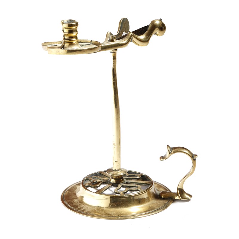 A George III brass wax jack, with a scissor action holder with a dished pan, the pierced base with a scroll thumbpiece, the underside stamped with an initial 'H', 13cm high.