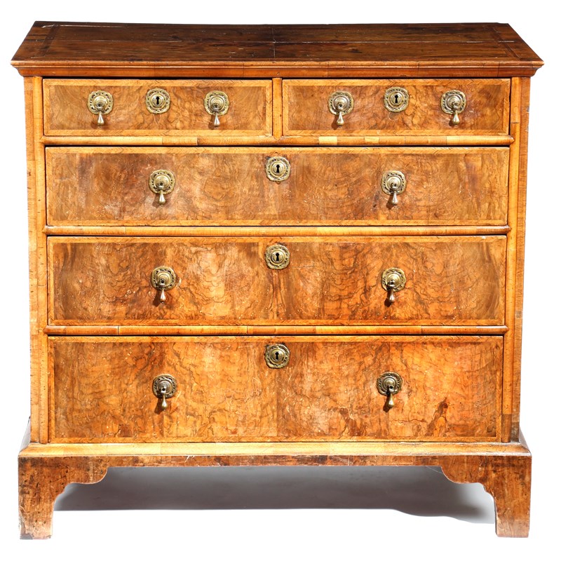 An early 18th century walnut chest, the quarter veneered top with cross and feather banding, above two short and three long graduated drawers, with cut-out runners, on bracket feet, 93.1cm high, 98.1cm wide, 58.4cm deep.