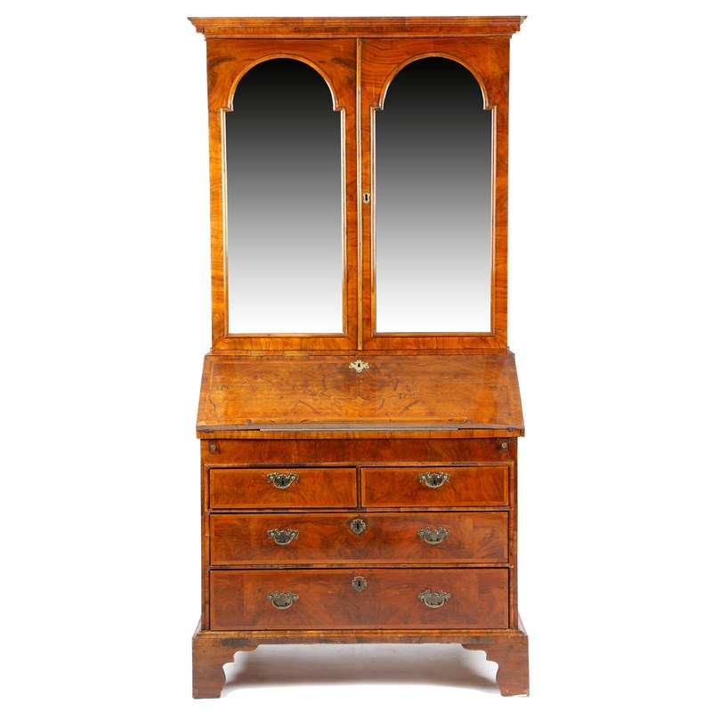 An early 18th century walnut bureau cabinet, the moulded cornice above a pair of arched bevelled mirrored doors, revealing pigeonholes, above a hinged fall, the interior with drawers, pigeonholes and a sliding well cover, with a brass presentation plaque, inscribed 'PRESENTED TO THE REV. E. F. D'OUVERGNE, BY HIS PARISHIONERS, ON THE OCCASION OF HIS SILVER WEDDING AND IN APPRECIATION OF HIS SERVICES FOR 22 YEARS AS VICAR OF LINDFIELD, SEPTEMBER 29TH 1908', above two short and two long drawers, on bracket feet, 202cm high, 102cm wide, 60cm deep.