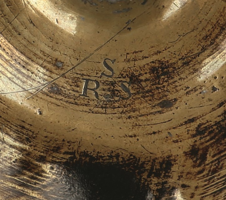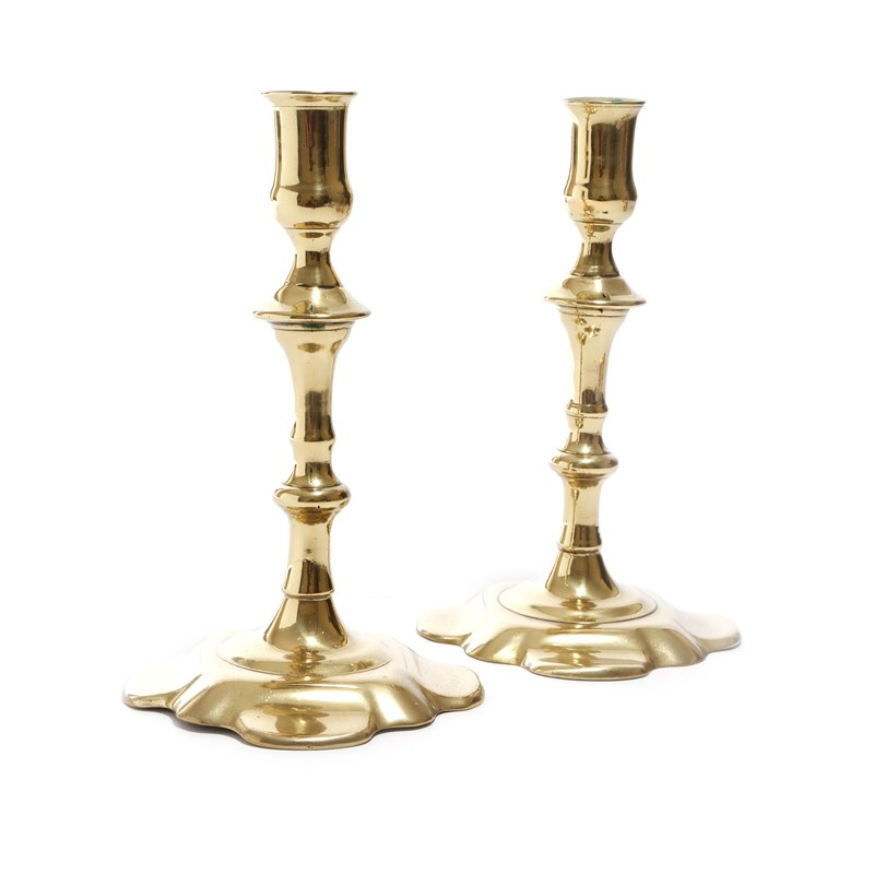 A pair of George II candlesticks, each with a knopped stem and a petal foot, the underside of each stamped with owner's triad initials 'S over RS', 20.8cm high. (2)
