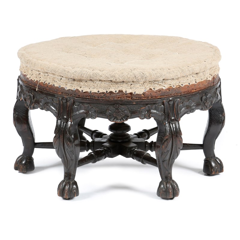 An 18th century style Dutch oak burgomaster stool, on leaf carved cabriole legs and stylised claw and ball feet and brass castors, late 19th century, 38.5cm high, 60.5cm diameter.