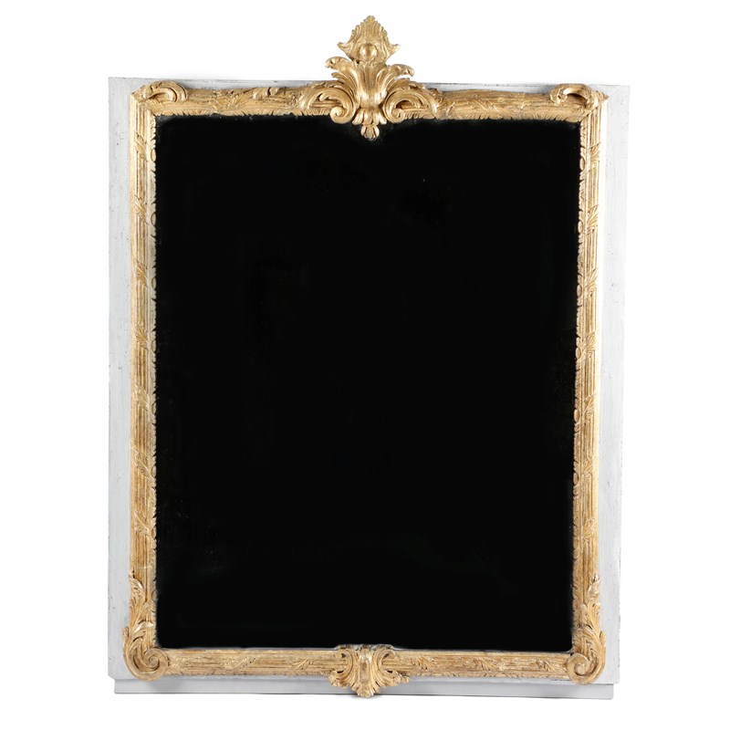 An 18th century French gilt and painted wood wall mirror, the later rectangular plate within a reeded and leaf carved frame, with a panelled back, 128.6 x 108.2cm.
