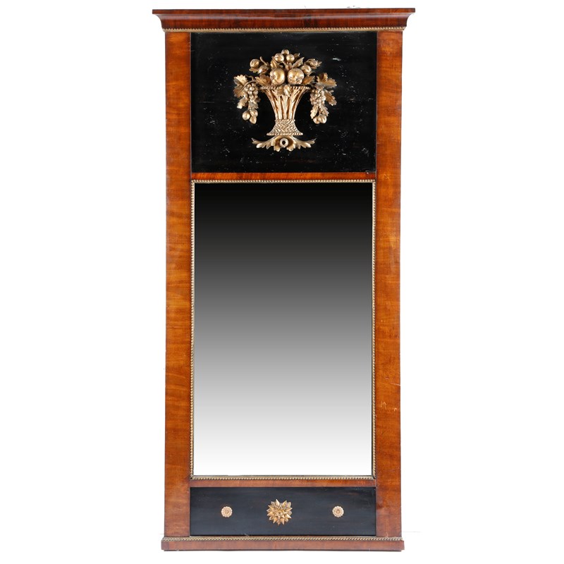 A 19th century German mahogany and giltwood wall mirror, the rectangular plate within a beaded slip surmounted by an ebonised panel, applied with a basket of fruit, possibly German, 155.7 x 75cm.