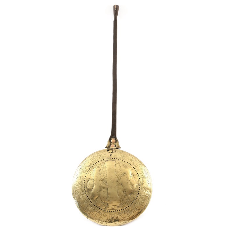 Two similar James II brass warming pans, each with an iron handle and a pierced hinged lid, one engraved with a central Royal Coat of Arms and inscribed ' GOD SAVE KING JAMES II', the other with the Lion and Unicorn flanking a column with initials 'I R' and inscribed 'GOD SAVE OUR SOVERAN LORD KING IAMES', 105.8cm long (max). (2)