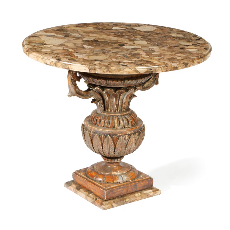 An Italian brèche marble and carved wood occasional table, the circular top with a moulded edge, supported by an urn on a conforming square base, 20th century, 53cm high, 62.3cm diameter.