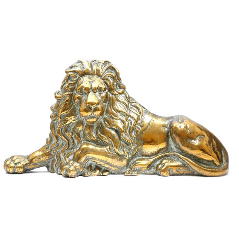A Victorian brass model of a recumbent lion, probably a fireside implement-rest, 33.8cm high, 68.3cm wide.