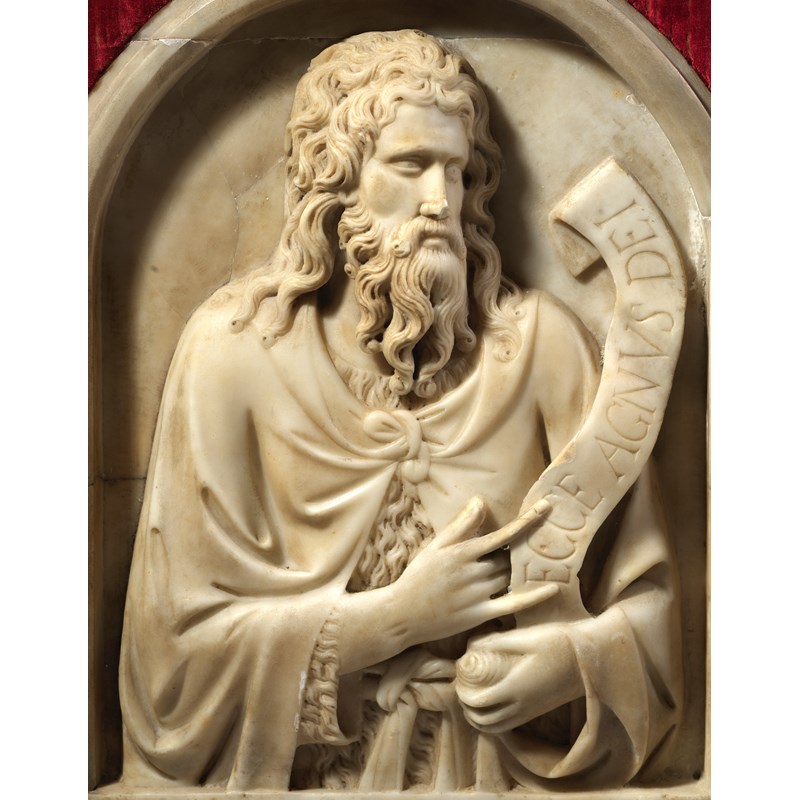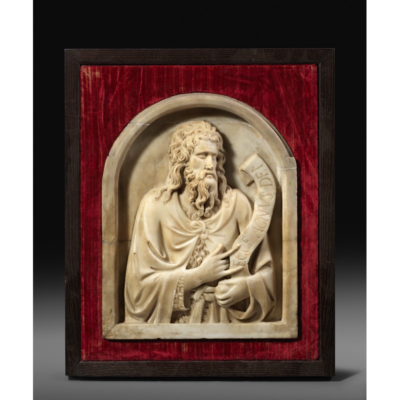 An Italian marble relief of St. John the Baptist after Tino di Camaino (c.1285-1337), depicting the saint wearing a cloak over a wool tunic, holding and pointing to a scroll, inscribed 'ECCE AGNUS DEI', in an integral arched frame, the back inscribed 'ESHER' and with inventory numbers '28635', possibly Napoli, 50 x 39.2cm, mounted in a later oak and velvet frame, 66 x 54.2cm (overall).