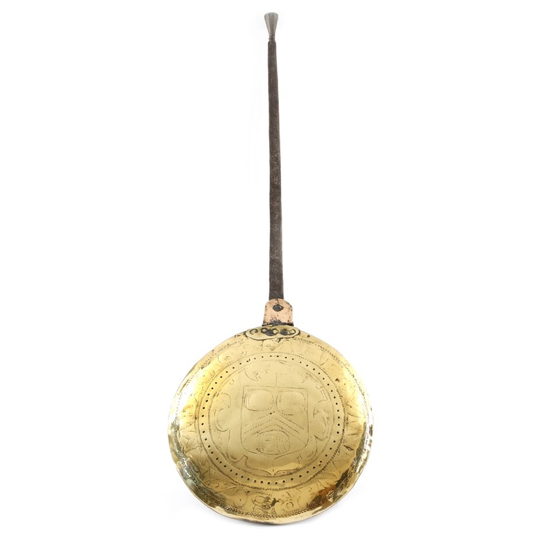 A Charles II brass warming pan, with an iron handle, the pierced hinged lid engraved with the Vintner's arms and inscribed the same and with the date '65', 105cm long.