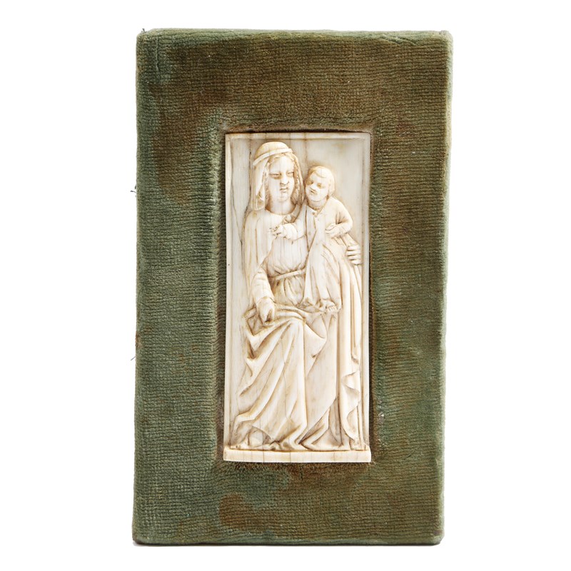 λ A late Medieval ivory relief carved plaque of the Virgin and child, possibly originally a book cover mount, probably Flemish, 14th / 15th century, 10.3 x 4.6cm, later mounted in a velvet covered oak frame with an easel back.