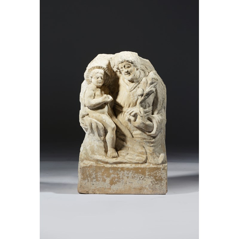 A 15th century French Caen stone relief, depicting St. Christopher holding a branch, carrying the infant Christ, with traces of polychrome painted decoration, 44cm high, 28cm wide.