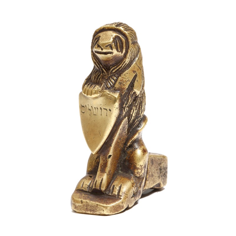 A bronze model of a heraldic seated lion, holding a shield, probably originally a chandelier / candelabra arm support finial, possibly South Netherlandish, Dinant, 14th / 15th century, 9.4cm high.