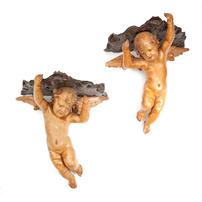 A pair of 19th century Italian carved pine angel wall brackets in Baroque style, each with a naturalistic top supported by a winged cherub, the angels possibly 18th century, 36.9cm high, 32cm wide. (2)