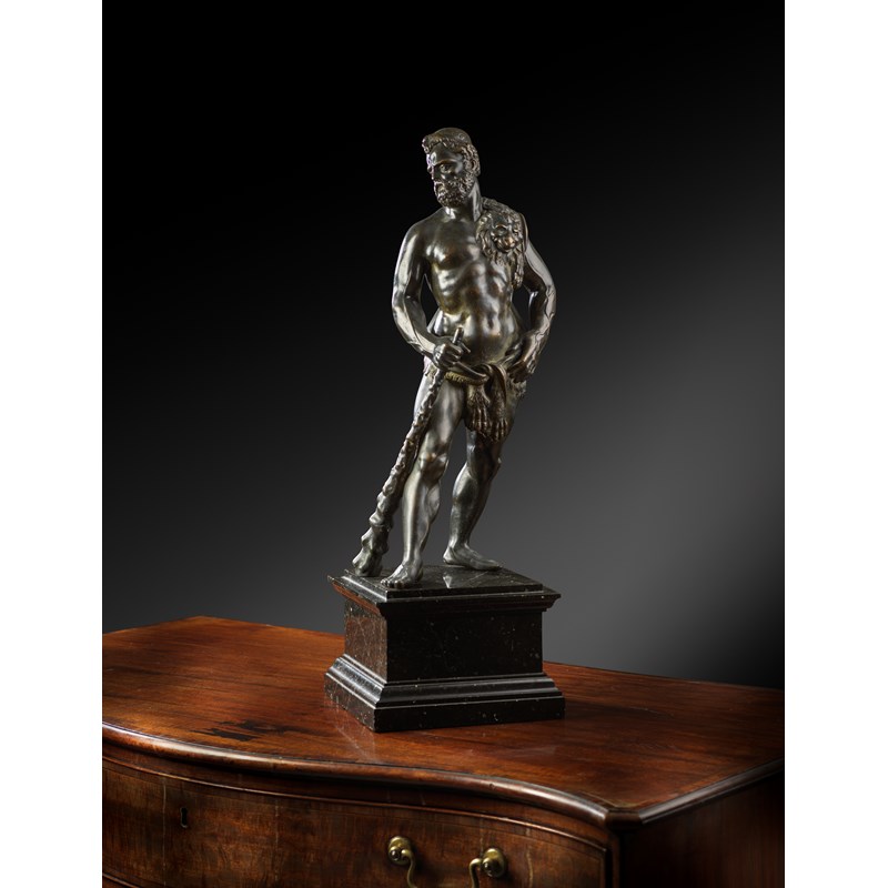 An Italian bronze figure of Hercules, the divine hero standing holding his club, his left shoulder draped with the Nemean lion's pelt, with bulging veins to his arms and feet, probably Florence, 17th century, 48.5cm high, later mounted on a black marble plinth, 63.8cm high (overall).