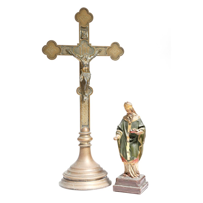 A 19th century brass crucifix, with a Corpus Christi, 56.8cm high, together with an Italian polychrome terracotta model of St. Nicholas of Bari, holding a book and four apples, 27cm high. (2)