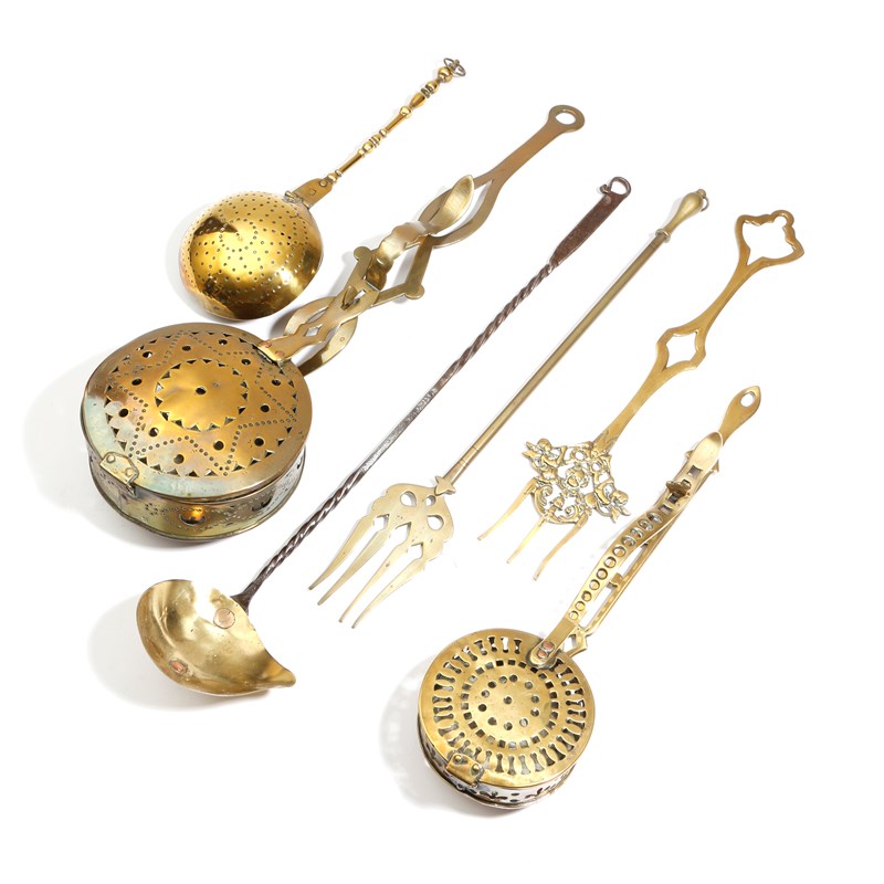 Three brass chestnut roasters, with pierced decoration and hinged lids, one 18th century with a turned handle, the largest stamped with a registration number '545964', together with two brass toasting forks and a brass ladle with a wrought iron handle, 60.5cm long. (6)