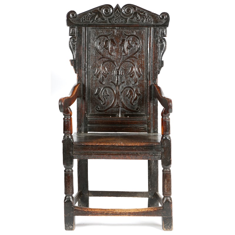 An oak panelled back open armchair in 17th century style, the surmount carved with scrolls, grapes and leaves and two crossed swords above the date '1610', above a panel carved with scrolling branches and leaves, on turned front legs united by peripheral stretchers.