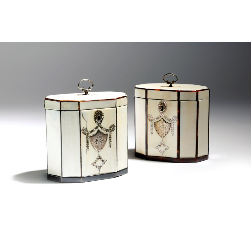 λ A near pair of George III ivory tea caddies, of octagonal shape, with tortoiseshell edging and inlaid with silver piqué work and mother of pearl dot decoration, each with a ring handle, a silver escutcheon and a shield shape plaque, one engraved with an elephant crest and the initial 'K', possibly for Knowles or Knollys, the other with the initial 'C', with vacant interiors, 11cm high, 11cm wide. (2)