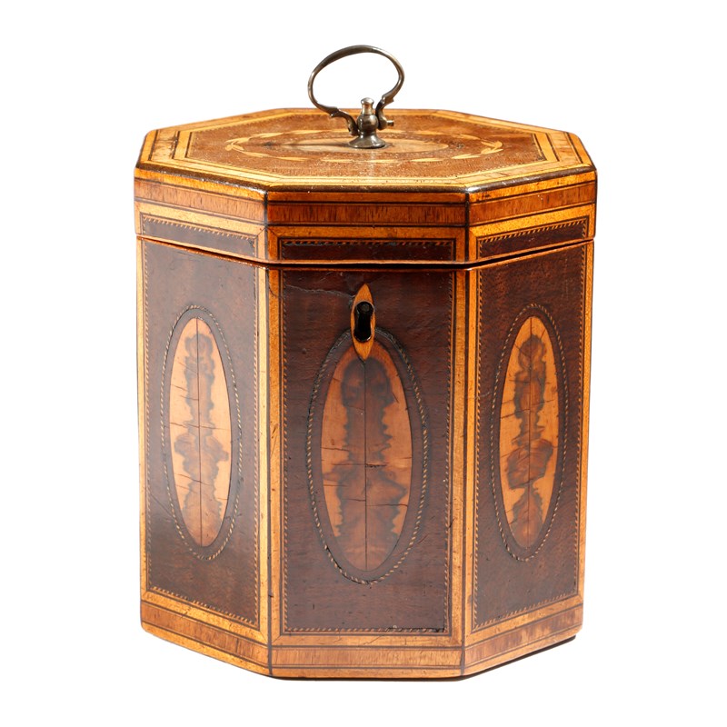 A George III harewood octagonal tea caddy, inlaid with stringing and tulipwood and planewood banding, the hinged lid with a wreath of husks and a brass ring handle, the interior with a lid with an oval burr panel, the exterior decorated with oval panels of various woods, three with book matched veneers, 13.9cm high.