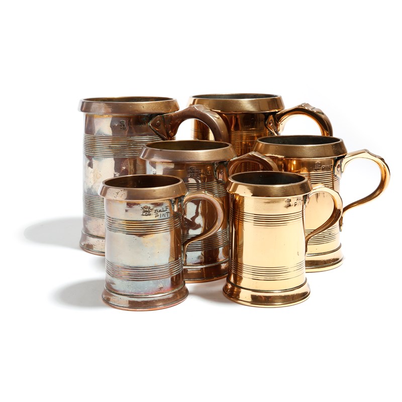 A matched set of six copper tankard measures by Loftus, each with two reeded bands, a scroll handle and stamped 'LOFTUS LONDON', comprising: two quarts, two pints and two half pints, various crown marks 'VR' and 'ER', late 19th / early 20th century, 15.7cm high (max). (6)