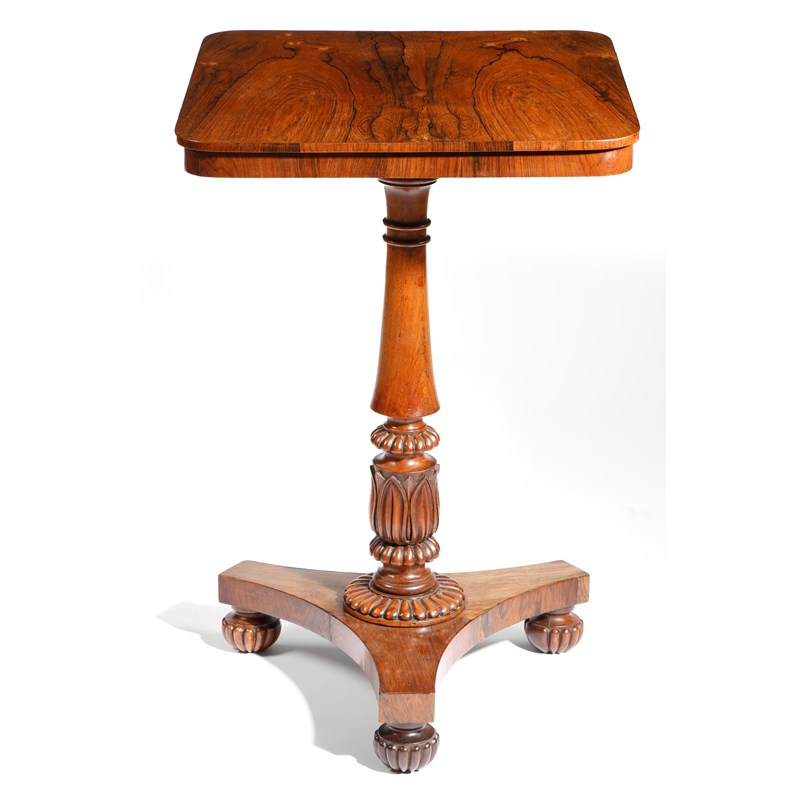 λ A George IV rosewood lamp table in the manner of Gillows, with a turned baluster and lappet carved stem, with nulled decoration and a triform base, 71.8cm high, 53.6cm wide, 47.6cm deep.