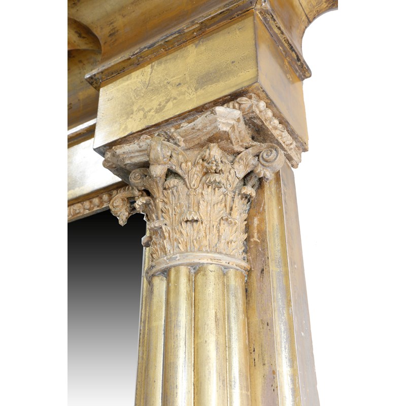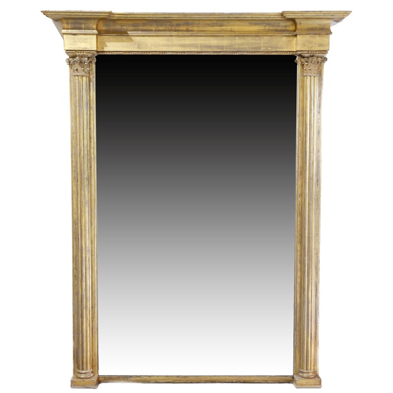 A large mid-19th century giltwood overmantel mirror, the rectangular plate flanked by cluster columns with Corinthian capitals, with an inverted breakfront frieze, 221 x 174cm.