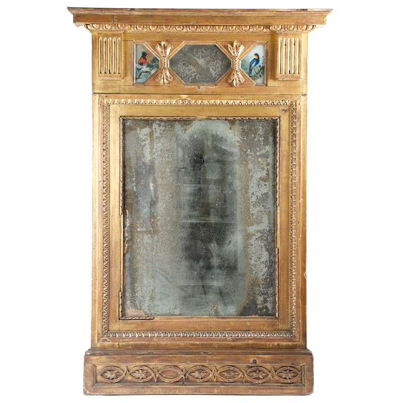 A Swedish Neo-classical giltwood pier mirror, the rectangular plate within a ribbon slip and a lappet carved frame, the frieze with an egg and dart moulding above a pair of reverse glass panels decorated with birds, flanking an etched glass panel decorated with ribbon tied war trophies, flanked by leaf batons, the base with a floret and ribbon band, Gustavian, late 18th / early 19th century, 160 x 107.6cm.