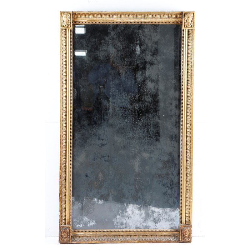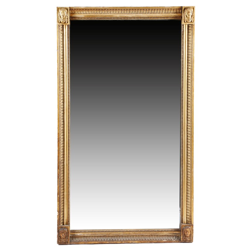 A Regency giltwood pier mirror, the rectangular bevelled plate within a beaded and leaf moulded frame, the corners with carved Egyptian style masks in the manner of Thomas Hope, 126 x 73cm.