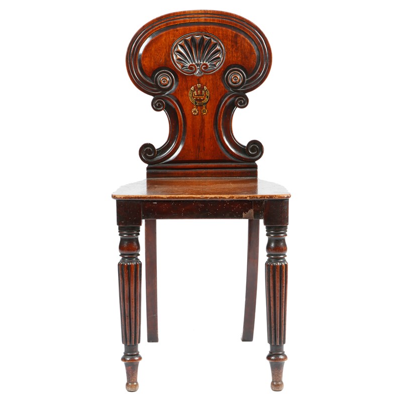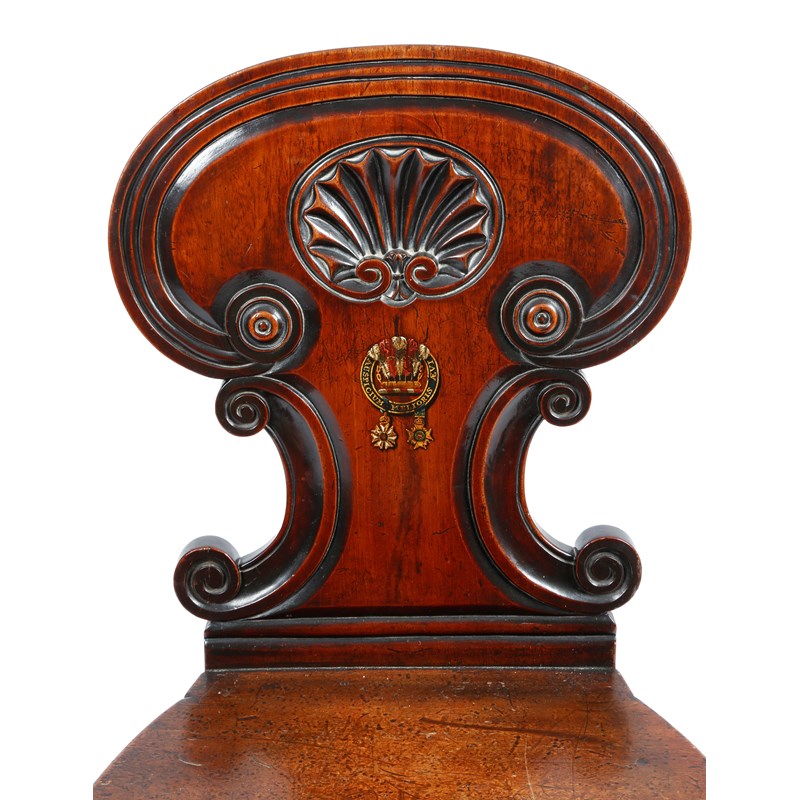 A George IV mahogany hall chair in the manner of Gillows, the gorget back carved with scrolls and a central shell and painted with a circlet for Sir Nicholas Harris Nicolas with plumes of feathers and the motto 'AUSPICIUM MELIORIS AEVI' and hung with two medals for the order of St. Michael and St. George and the Royal Guelphic order, on ribbed front legs.