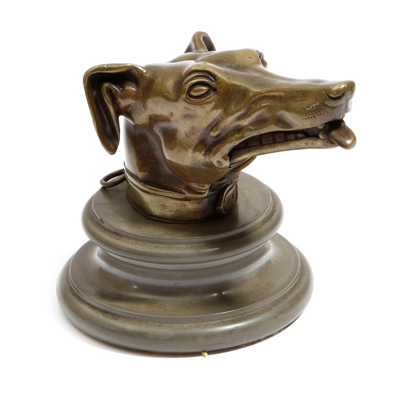 A Victorian bronze greyhound's head card holder, with an articulated jaw, mounted on a turned marble socle, 8.8cm high.
